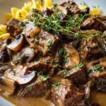 Ein warmes und cremiges Rindfleisch Stroganoff, das zartes Rindfleisch mit Champignons und einer aromatischen Soße kombiniert.