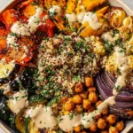 Eine wohltuende Bowl mit geröstetem Gemüse, Kichererbsen und einem cremigen Tahini-Dressing, ideal für jede Gelegenheit.
