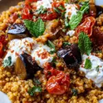 Ein köstliches und nährstoffreiches Gericht aus Bulgur, gerösteten Auberginen und frischen Tomaten, verfeinert mit einem cremigen Joghurtdressing.