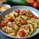 Eine einfache und köstliche Maultaschenpfanne mit Zucchini, Kirschtomaten und einer cremigen Sahnesauce.