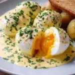 Traditionelles Gericht mit perfekt gekochten Eiern in einer cremigen Senfsoße, serviert mit Kartoffeln.