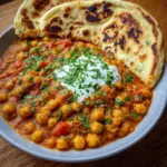 Ein aromatisches Kichererbsen-Curry, perfekt serviert mit frisch gebackenem Naan-Brot. Ein gesundes und köstliches Gericht voller Geschmack.