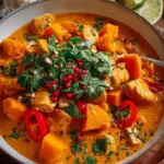 Ein köstliches Kürbis-Hähnchen-Curry mit Kokosmilch, das eine perfekte Balance aus süßen und würzigen Aromen bietet und Ihr Zuhause mit Wärme erfüllt.