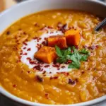 Eine nahrhafte rote Linsensuppe mit Süßkartoffeln, die durch ihre cremige Textur und harmonischen Aromen besticht.