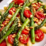 Ein frischer Spargelsalat mit saftigen Tomaten und gerösteten Pinienkernen, perfekt für warme Tage.