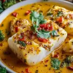 7. Sauce darüber geben: Gieße die Kokosnuss-Curry-Sauce über die Kabeljaufilets, sodass sie vollständig bedeckt sind.